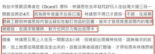 一位酒伴计工暗意林靖恩在酒店打砸电视机,而且语言手忙脚乱,致使还平直吐痰,临了不得已报警求援,着力一个多小时后林靖恩再次复返酒店,访佛之前的作为,令东谈主颇为惶恐。 通过这个酒店使命主谈主员的描绘,不错看出林靖恩现时的景况确乎碎裂乐不雅,而且咫尺的她仍是耽溺为没屋子住的情况,因为李坤城留住的屋子被她廉价售出,而且所获财富,仍是被花光了。